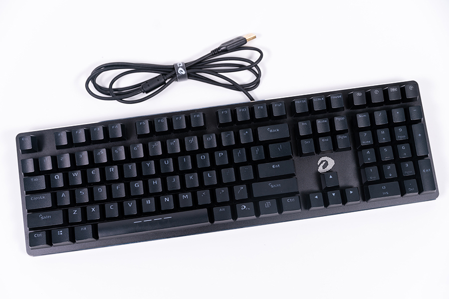 將目光焦點對準我們的產品主角,達爾優EK925 RGB鍵盤采用了108鍵布局,為懸浮式設計,從平視角度看還能直接看到鍵盤的軸體,這樣的設計也有利于呈現出更好的透光效果。數據線與鍵盤連為一體,黑色橡膠材質,線長約為1.8m,線材配有抗干擾磁環和理線帶,USB接口為鍍金設計。