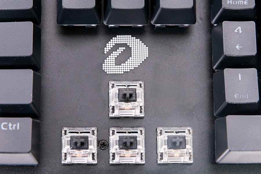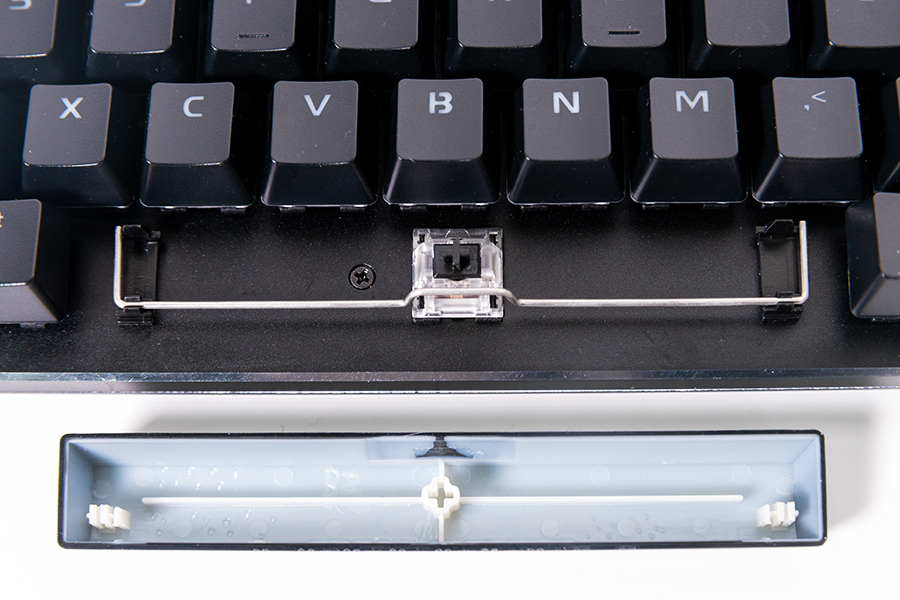 鍵盤的大鍵位則一體式平衡桿結構,鋼絲卡扣位于鍵帽的內部,手感的表現上也還不錯,保持了黑軸回彈迅速的特點,敲擊時沒有惱人的鋼絲聲。