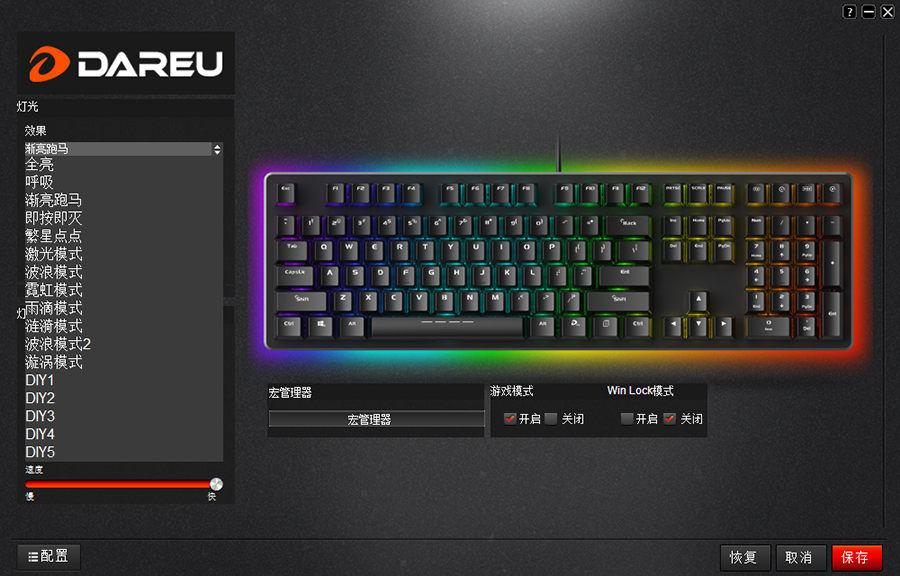 想要變化RGB燈效不僅可以通過組合鍵來實現,這款達爾優EK925RGB機械鍵盤還可在官網下載鍵盤的驅動支持,安裝驅動后自定義鍵盤的RGB光效變化,并且可以自定義調節宏鍵、組合鍵等功能,不過這個驅動界面稍顯簡陋,未來如果能更新一下驅動內容或許能開發出一些新玩法。
