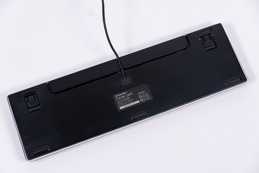 鍵盤的底部設有5個弧形的防滑橡膠貼,鍵盤底部出線口設有走線槽,而且還做了加固處理。左上和右上角各有一個腳墊可向上抬起。