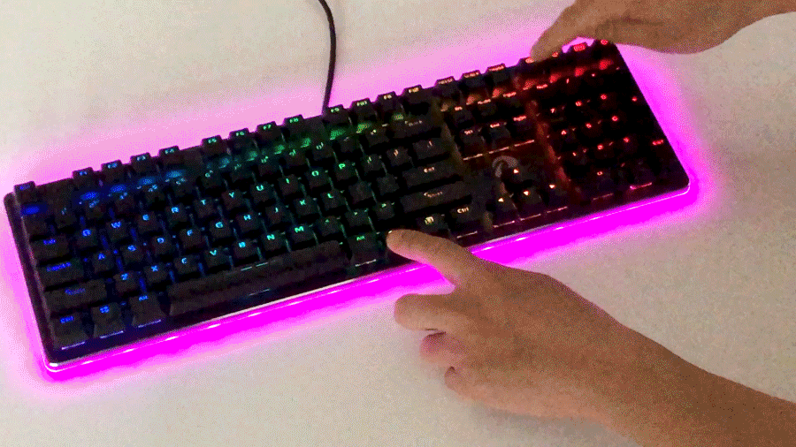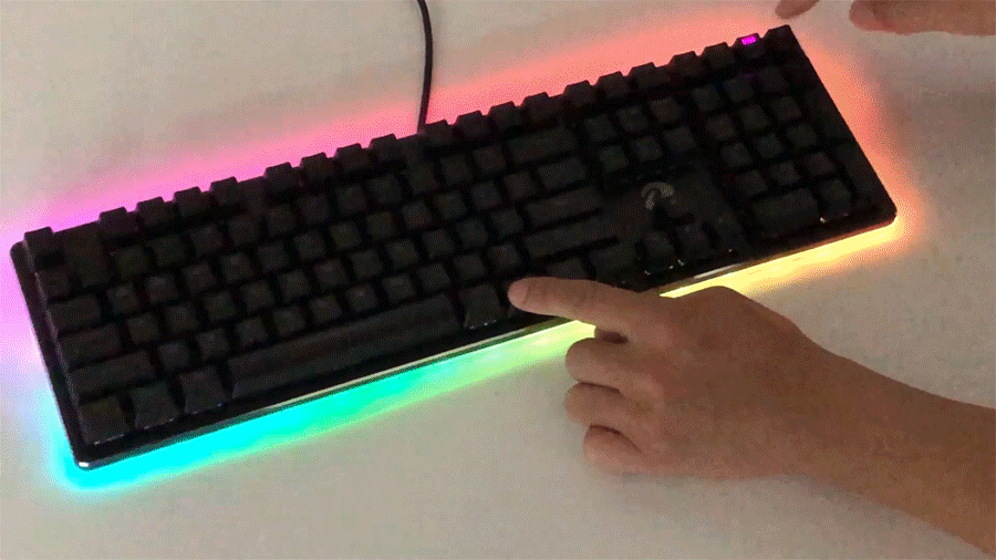 在鍵盤邊緣的下沿設有一圈透明燈帶導光層,由此處展現長方形的外圈RGB光效。