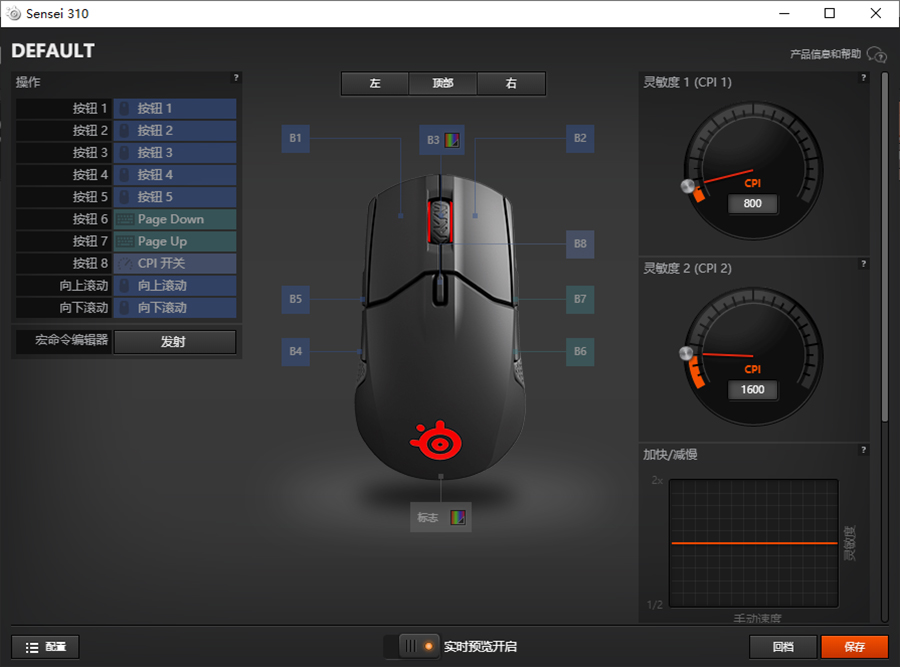 雖然在賽睿官方的SteelSeries Engine驅動軟件許多強大的擴展性能并不能在賽睿Rival 310游戲鼠標上得到使用,不過還是能在這款驅動軟件上實現更換燈效,自定義編程按鍵以及更改鼠標靈敏度,RGB燈效的修改可以實時預覽。這些核心功能足以應付平日的游戲操作,要再多一些花里胡哨的功能那就只能加錢購買更高級的鼠標啦。
