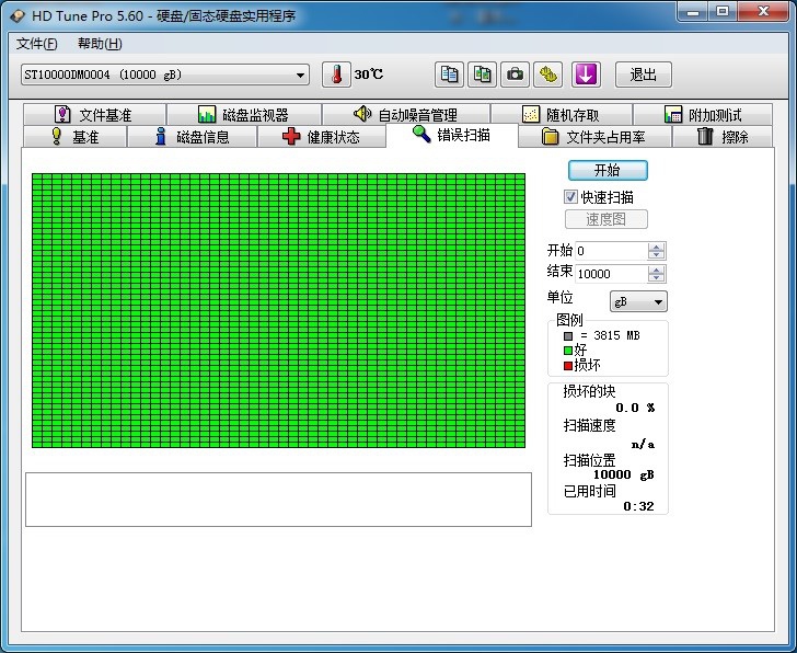 雖然新的外觀確實很好看,但是速度才是評判一塊硬盤好壞的第一標準。首先用HD Tune Pro檢測下壞道。