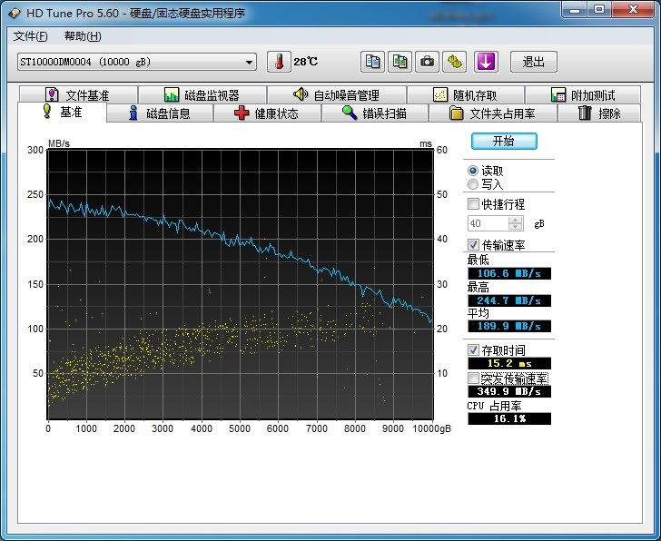 繼續測試可以看到,硬盤的最低讀取速度為106.6MB/s,而最高讀取速度為244.7MB/s,平均速度為189.9MB/s,測試的曲線變化不大,非常平穩