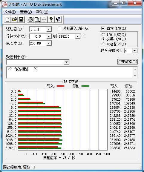 通過測試結果可以看出,最高讀取速度是249.128MB/秒,最高寫入速度為242.286MB/秒