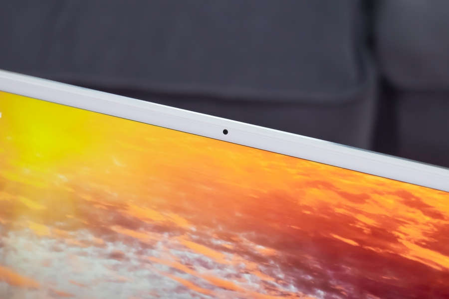 翻開屏幕,首先看到的是攝像頭的位置發(fā)生了變化,由原來的屏幕底部移到了頂部居中位置,從而避免了鼻孔視角的尷尬。不過因此XPS 13 9380的額頭相比上代產(chǎn)品要稍微寬些,但好在底部邊框有所收斂。同時,XPS 13 9380的攝像頭也發(fā)生了微妙的變化,使用了筆記本界最小的2.25mm全新四元透鏡式攝像頭,但略有遺憾的是人臉識別因此而被取消。
