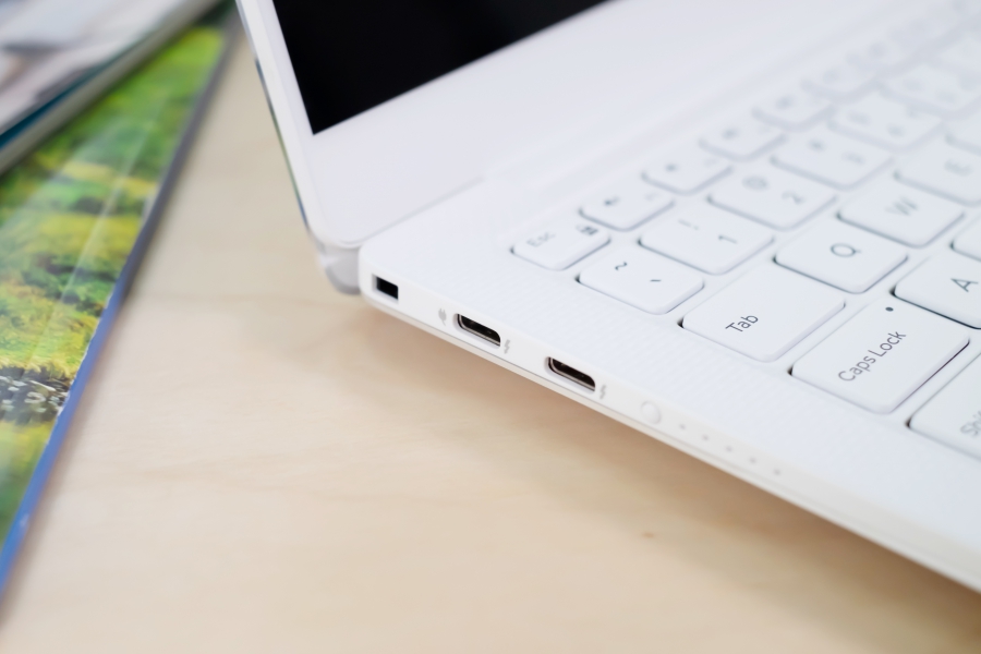 接口方面,機身左側(cè)有兩個支持雷電3協(xié)議的Type-C接口,都能作為充電接口來使用。同時用來連接顯卡拓展塢或者外接顯示器也會有不錯的體驗,它最高支持連接兩臺4K顯示器,傳輸速度最高可達40 Gbps,是傳統(tǒng)USB 3.0的8倍。此外在接口下方還依附有一個電量按鍵以及五顆電量指示燈,每顆指示燈代表20%的電量,在關(guān)機狀態(tài)下也可顯示,這點非常實用。