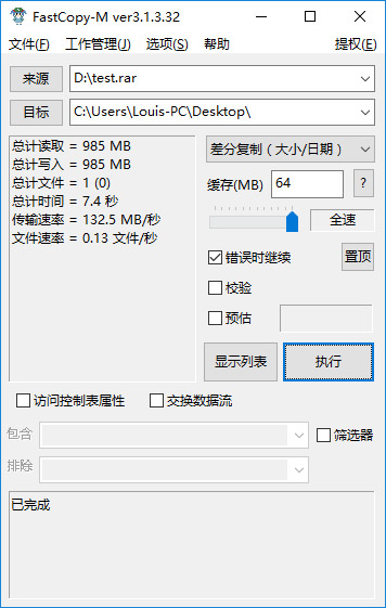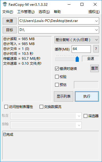 FastCopy實測寫入速度為93.7MB/s,讀取速度為132.5MB/s