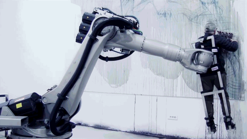 在這,以前用于工廠生產的機器人帶著伊利奇和他的畫筆圍繞這一塊大大的大帆布旋轉,據說是模仿“技術成果中的重復性,和對作者自身習慣式或跨越式經驗的新階段的代表性。”