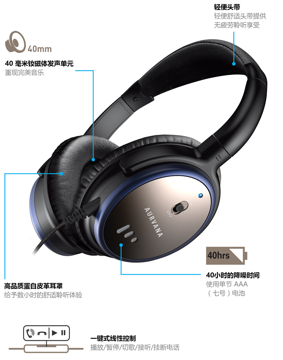 Aurvana ANC還支持線控,可以控制音樂播放以及接聽,掛斷電話,非常方便,40mm的發聲單元是音質的有力保保障。是一款非常可以勝任各種環境的耳機產品。