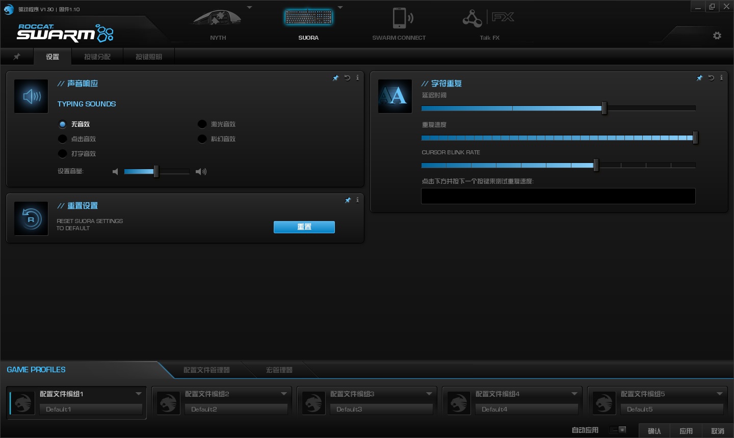 這款鍵盤的驅(qū)動比較簡單,一共只有三頁,第一頁可以對聲效(建議不要打開)以及鍵盤速度進(jìn)行基本的設(shè)置