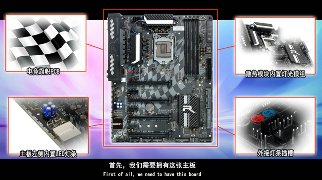 首先,我們需要擁有這張主板(圖注電競主題:電競旗幟PCB、散熱模塊內置燈光模組、主板左側內置LED燈條、外接燈條插槽)