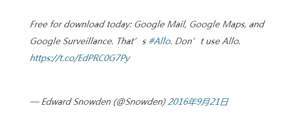 他在Twitter上揶揄地表示:“今日免費下載:谷歌郵箱、谷歌地圖,以及谷歌監視。對,后者就是Allo。千萬不要使用Allo。”
