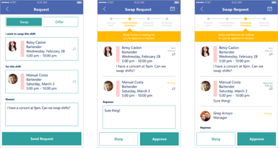 乍一看,StaffHub似乎只是一個共享日歷,類似于Outlook,但也有些許不同。人員時間調動無疑是排班表中最麻煩的事情,而StaffHub則解決了這個問題。在StaffHub中工作人員可以調換自己的班次或者請他人代替。StaffHub還可以發送消息,便于管理。但這些消息可能會被雇主監視,微軟并沒有對這一點進行解釋。
