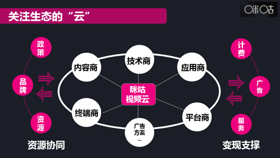 其中,從生態層面觀察,咪咕·視頻云涵蓋了內容、終端、技術、應用、平臺、廣告方案等六大方面,通過多方廠商所構建的生態閉環實現內容變現支撐,央視網、央廣視訊、人民視訊、中投視訊等咪咕視頻戰略合作伙伴都基于此生態云運行。