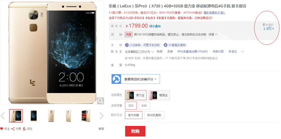 去年開始進入手機市場的樂視,模仿小米的套路,同樣主打高性價比及軟件生態服務,性價比做的比小米更加極致,但效果卻不如小米。到目前為止,樂視進入手機市場已經接近兩年了,但樂視手機的銷量一直不溫不火,品牌關注度也很低,遠不如當初的小米。今年9月發布的樂Pro 3,采用高通驍龍821頂級處理器,4GB+32GB的標準版售價才1799元,是目前價格最低的驍龍821處理器手機。這款手機發布以來一直開放購買,無需預約和搶購,但從京東的數據來看,這款手機的銷量很一般,評價僅有1.8萬,而同樣是驍龍821處理器,4GB+32GB價格從1899起的小米5S,京東評價有5.3萬。