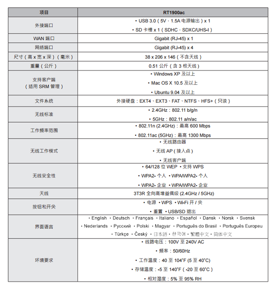 群暉RT1900ac路由器的各項參數,配備雙核1.0G處理器,3T3R全向高增益偶級天線,支持各種操作系統,重量為0.51KG。