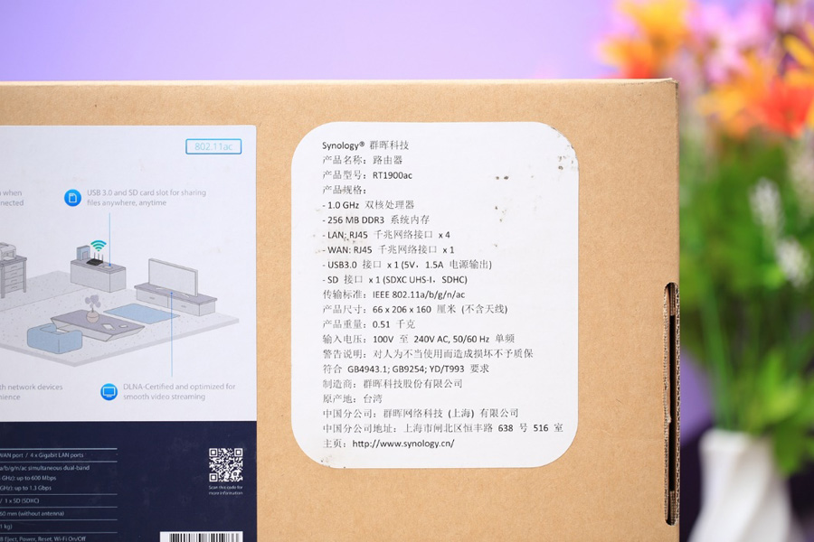 包裝盒的背面有群暉RT1900ac無線路由器的詳細參數,雙核1.0GHz的處理器,搭載256MB DDR3內存,支持802.11ac無線傳輸與2.4/5GHz同步雙頻段傳輸,速度總和高達1900Mbps