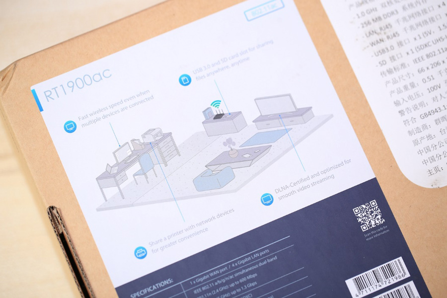包裝背面還有一個特別的使用場景,這是在告訴我們,傳統的路由器發送無線訊號都是向四面八方平均傳輸的,而群暉RT1900ac無線路由器卻可以通過智能調控,然后針對6臺以內的設備聚集發送無線訊號,從而降低延遲與功耗。對手游玩家來說,這個功能確實非常靠譜。