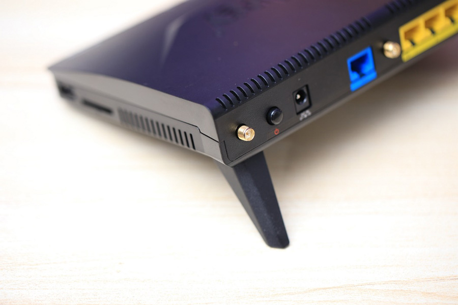 在主機的背面分布著密密麻麻的散熱孔,2個支架接口同時還有2個開拆卸的腳架,當然撐起來,也可以讓路由器更好的散熱。此外在背面還隱藏了一個路由器的重啟按鍵。