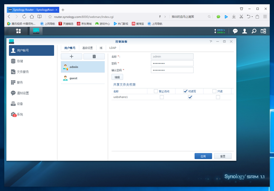 在用戶賬戶欄可以方便改寫密碼,同時也可以對共享文件進行管理,在存儲欄可以對SD卡或者外接USB存儲器上的文件進行讀寫操作。