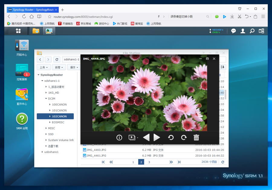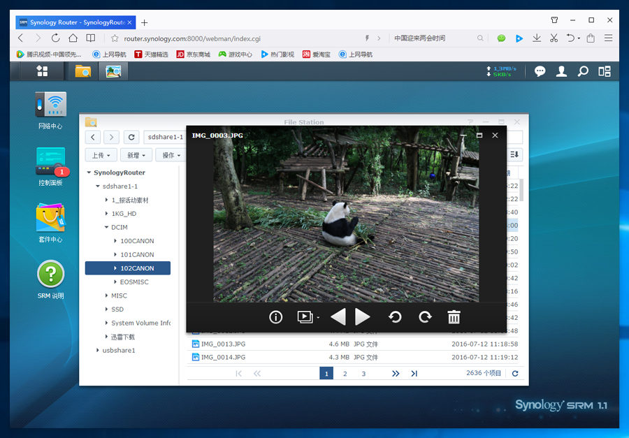 群暉RT1900ac無線路由器上我插入了SD卡,和一個U盤,之后SD卡與U盤中的內容就可以通過路由器云輕松共享到所有連接到這臺路由器的主機。瀏覽相機中的SD卡,速度也非常的快。