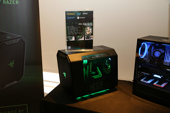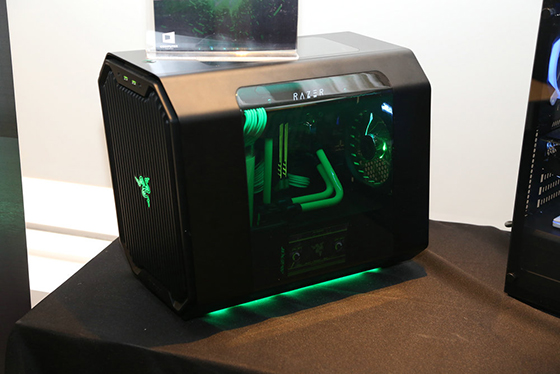 在安鈦克展臺(tái),吸引眼球的便是臺(tái)上的那臺(tái)安鈦克CUBE雷蛇版機(jī)箱,獨(dú)特的外形設(shè)計(jì)與小巧的身材吸引了不少高端玩家的關(guān)注,而在雷蛇logo的信仰加持下,這款機(jī)箱更是顯得逼格十足。在展臺(tái)上的這臺(tái)機(jī)箱經(jīng)過了高端玩家的改裝,在下方還擁有一塊顯示屏,可以查看CPU與GPU的溫度狀態(tài)。此外,這款機(jī)箱的內(nèi)部設(shè)計(jì)特地為高端游戲玩家打造,能夠輕松制作分體水冷,是一款性能強(qiáng)勁的小鋼炮!
