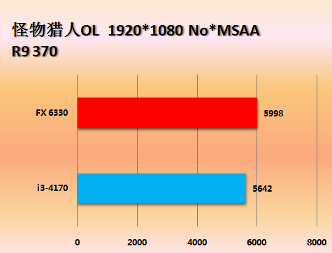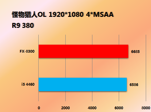 在均使用R9 380顯卡的情況下,F(xiàn)X 8300和Core i5 4460的對決中FX-8300以更加優(yōu)秀成績勝出,雖然兩款處理器都可以滿足《怪物獵人OL》的性能所需,保證顯卡可以發(fā)揮完整實力。在性能接近的情況下,F(xiàn)X 8300的價格優(yōu)勢便體現(xiàn)了出來,用戶花800元和花1200元所獲得體驗是相同的,那么選擇FX 8300才是最佳購買策略,由此可看出性價比更高的FX 8300更適合用來運行《怪物獵人OL》。