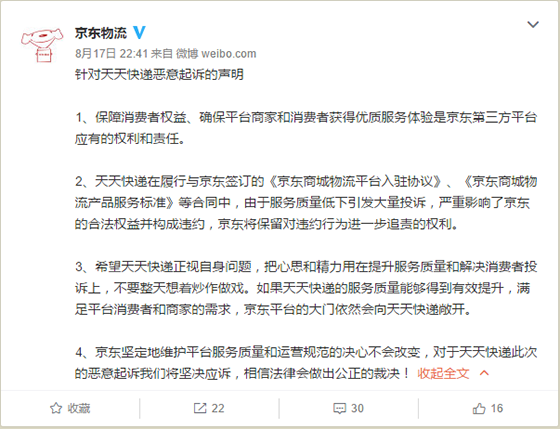 天天快遞起訴京東 京東回復(fù):別拿我炒作