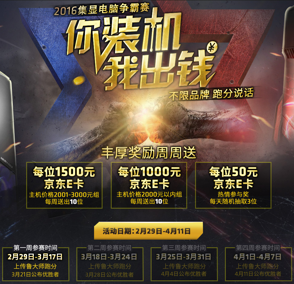 據悉,“你裝機我出錢,2016集顯電腦爭霸賽”活動時間為2月29日至4月11日。凡在2016年2月1日后(含),在京東購買集顯電腦的用戶(含京東組裝電腦、京東UPC、DIY攢機,不限品牌),均可在裝機大師游戲社區上傳所購機型魯大師跑分結果截圖,按價格分為高端集顯組(主機價格2001元-3000元)與主流集顯組(主機價格2000元以內)。按跑分排名,每周兩個組別前10名分別送出每位1500元京東E卡與1000元京東E卡大獎。同時每天還會隨機抽取3名幸運參賽者,給予每位50元京東E卡的熱情參與獎。有關活動的詳情請狂戳活動頁面了解:http://sale.jd.com/act/aU3ZF1DY4u.html