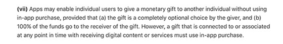 “只要滿足以下條件,應(yīng)用便可讓用戶向另一個(gè)用戶贈(zèng)送貨幣禮物,而不必使用應(yīng)用內(nèi)購:(a)該禮物必須是贈(zèng)送者的自主選擇;(b)100%的資金都要提供給禮物接受者。然而,如果這種禮物與獲取數(shù)字內(nèi)容或服務(wù)有關(guān),就必須使用應(yīng)用內(nèi)購。”