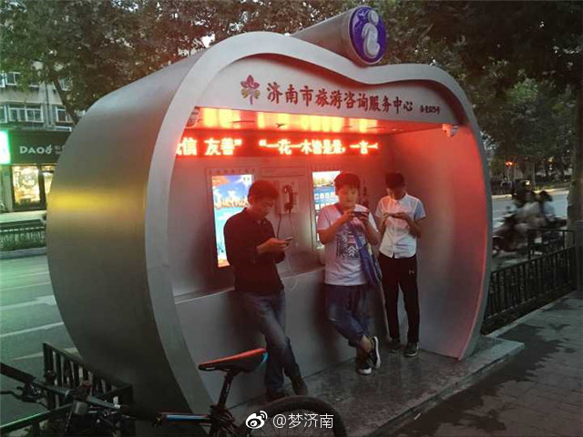 國內(nèi)很多城市都有提供旅游咨詢的街頭服務(wù)設(shè)施,通常會提供公共電話、旅游查詢等功能。但隨著智能手機的普及,這些旅游咨詢設(shè)施的功能被取代,大多數(shù)漸漸成為“擺設(shè)”,很多地方也在嘗試對其進行改造。近日,濟南街頭的一個大蘋果造型的“旅游咨詢服務(wù)中心”與時俱進地添加了充電服務(wù)和無線Wi-Fi功能,大大增加了其實用性,得到了不少過路市民的垂青。