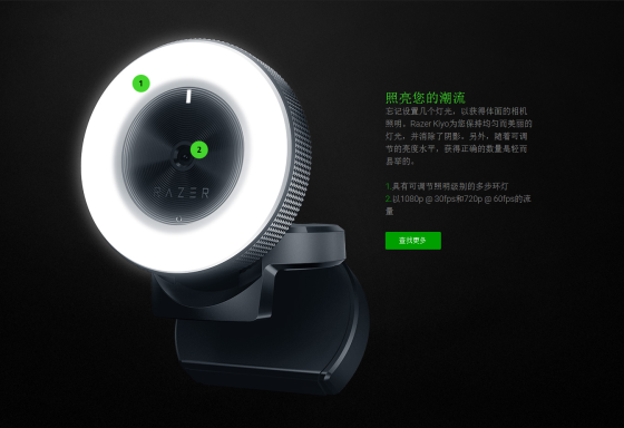 Razer Kiyo網絡攝像頭擁有可調節的環形燈,它由十二個白色LED組成,亮度有十二個級別可以調節。攝像頭鏡頭擁有四百萬像素,可錄制1080p、30fps視頻,或是720p、60fps視頻。Razer Kiyo在海外的售價為99.99美元,約合人民幣663元。