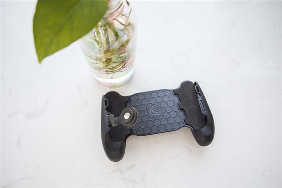 小雞手柄F1外觀為手柄樣式,與索尼PlayStation手柄造型類似,F1在中間留出一個卡槽,采用可拉伸設計,可以將手柄拉開夾住手機。