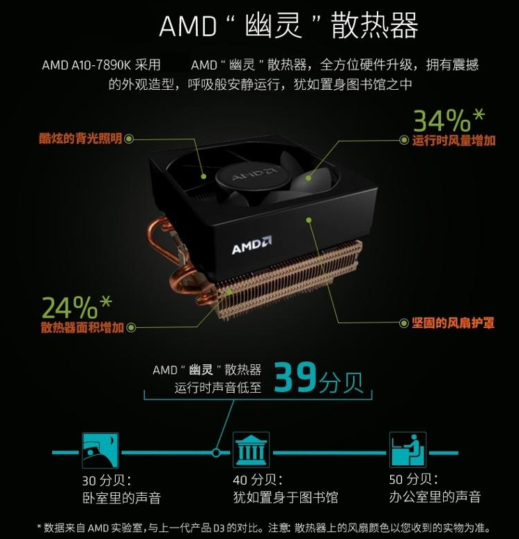 值得玩家關注的是,A10-7890K的整體熱設計功耗保持在了95W,并且配備新的Wraith(幽靈)散熱器散熱能力可達125W,炫酷的外觀搭載有AMD可發光Logo設計,更能表達玩家的個性需求。