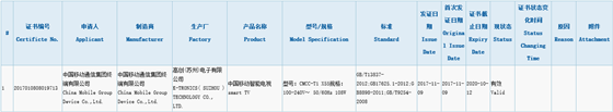 在國家3C質量認證中心已經可以查詢到一款“中國移動通信集團終端有限公司”為申請人和制造商,由“高創(蘇州)電子有限公司”生產的“中國移動智能電視smart TV”,型號為CMCC-T1 X55,按一般的型號命名規則,這款電視應該是55英寸大小,發證日期為11月9日。