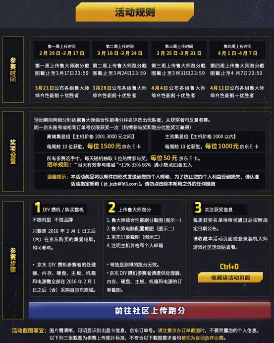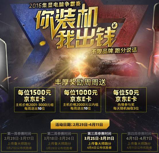 “你裝機我出錢,2016集顯電腦爭霸賽”活動時間為2月29日至4月11日。凡在2016年2月1日后(含),在京東購買集顯電腦的用戶(含京東組裝電腦、京東UPC、DIY攢機,不限品牌),均可在裝機大師游戲社區上傳所購機型魯大師跑分結果截圖,按價格分為高端集顯組(主機價格2001元-3000元)與主流集顯組(主機價格2000元以內)。按跑分排名,每周兩個組別前10名分別送出每位1500元京東E卡與1000元京東E卡大獎。同時每天還會隨機抽取3名幸運參賽者,給予每位50元京東E卡的熱情參與獎。