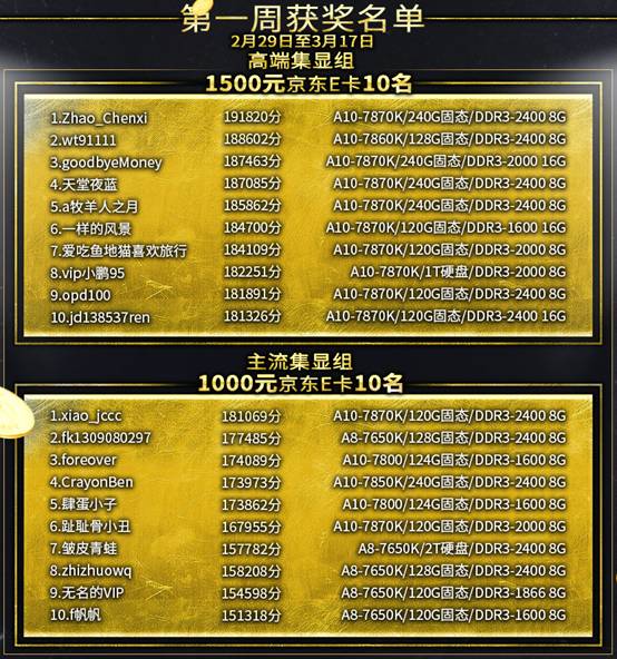 自從2016年的腳步進入到了3月,由AMD與京東商城聯手為玩家帶來的有獎裝機曬單活動“你裝機我出錢 2016集顯爭霸賽”便獲得了眾多消費者的熱情關注。截止到目前為止,參與跑分曬單的玩家已經超過千人并且總計已經有超過40名玩家獲得了京東E卡的獎勵!現在活動前兩周的戰果已經公布并且已經開始了第三周的打榜較量,我們今天就為大家帶來前兩周的賽事解析,還沒參加活動的玩家請猛戳這