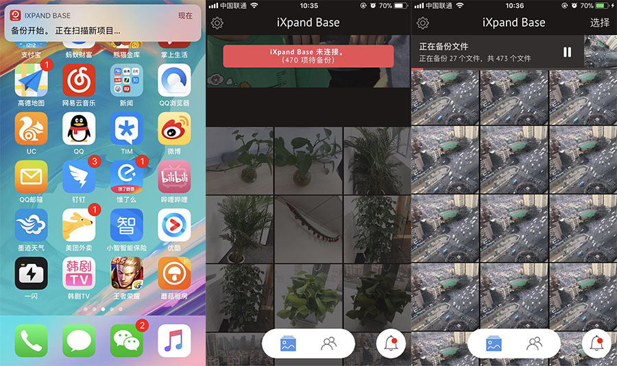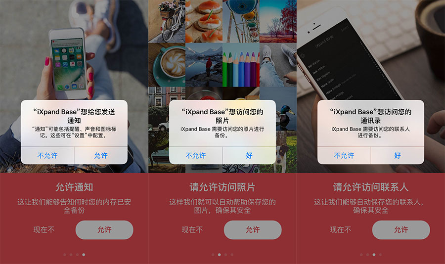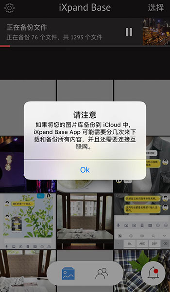 當USB連接線接上,電源插座插好后,就可以開始給設備充電同時備份文件了,在第一次連接充電時會在界面提示進入app store安裝iXpand Base的app,打開之后即可使用備份功能,進入app的時候會彈出幾個通知,要求允許通知,訪問照片和聯系人等界面,允許后進入備份界面。