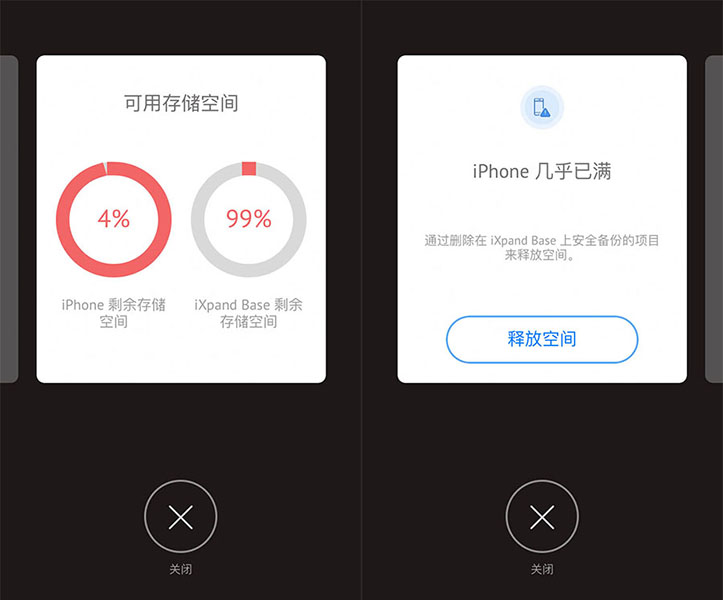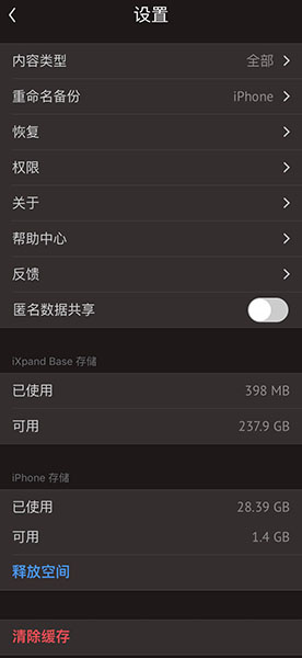 在app的右下角有個鈴鐺的圖標按鈕,功能為顯示手機的剩余空間和備份充電座的剩余存儲空間。