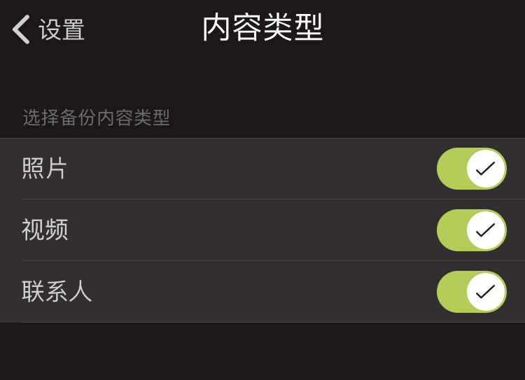 內容類型進入后可以選擇備份資料的類型,如照片視頻以及通訊錄。