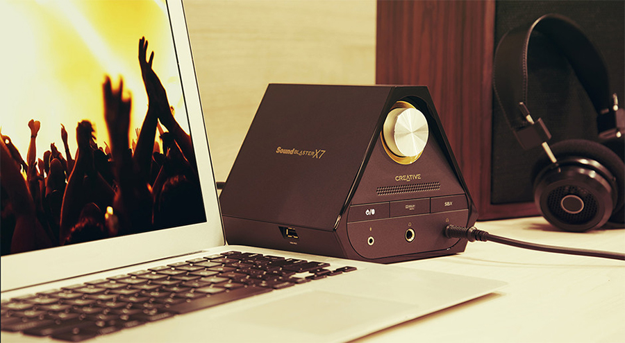創新Sound Blaster X7采用了三角造型的機身,左右兩側都印有Sound Blaster X7的logo,正面非常簡潔。耳機輸出采用兩種規格設計,隨便什么耳機都不用轉接頭了,降低一切可能的音頻損耗。