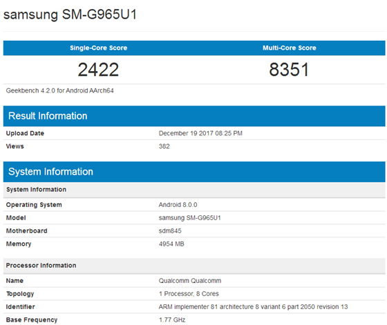 跑出這個分數的設備型號為samsung SM-G965U1,據猜測應該是三星Galaxy S9+,這也是確定將首發搭載驍龍845的機型之一。另外,識別碼ARM implementer 81也是高通驍龍Kryo核心的標識之一,所以大致能確定這一跑分確實是由高通驍龍845跑出。