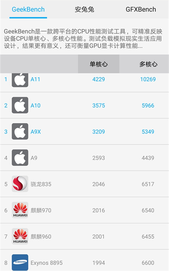 在測試結果中,驍龍845單核得分為2422,多核的人8351,相比于上一代驍龍835的跑分,單核、多核分別有約19%、28%的提升。不過在天梯榜中,比起榜首蘋果A11處理器“開掛般的存在”,差距依然巨大。
