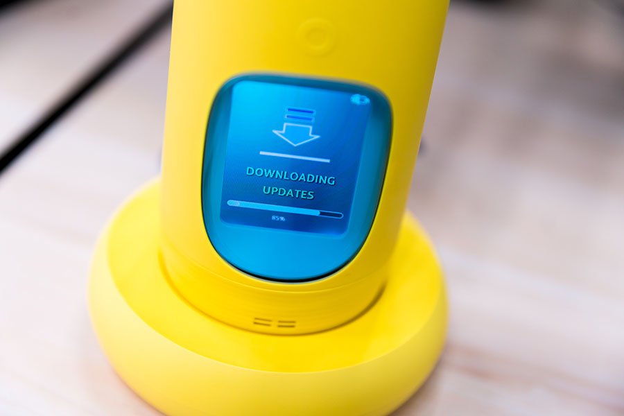 Gululu是一款適用于3-10歲年齡的兒童智能水杯,一共有海洋藍、珊瑚粉、潛水艇黃三種顏色款式提供選擇,我們這次評測拿到的是潛水艇黃色款,水杯有400ml儲水容量,水杯外部整體采用軟膠材質,杯蓋采用的是按鈕彈出的設計,單手操作相當的方便,扣上安全扣之后將水杯倒放,也沒有發生漏水現象,密封性能良好。