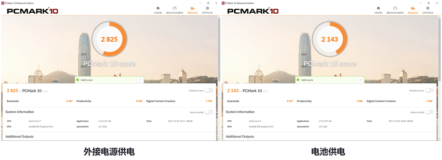 用PCMark 10進行基準辦公測試,外接電源得分2825分,電池供電時2143分,已經是超極本中相當高的水準,用戶無論是進行視頻聊天、文檔編輯、瀏覽網頁、影音處理等日常工作都能在靈越5280上流暢進行。