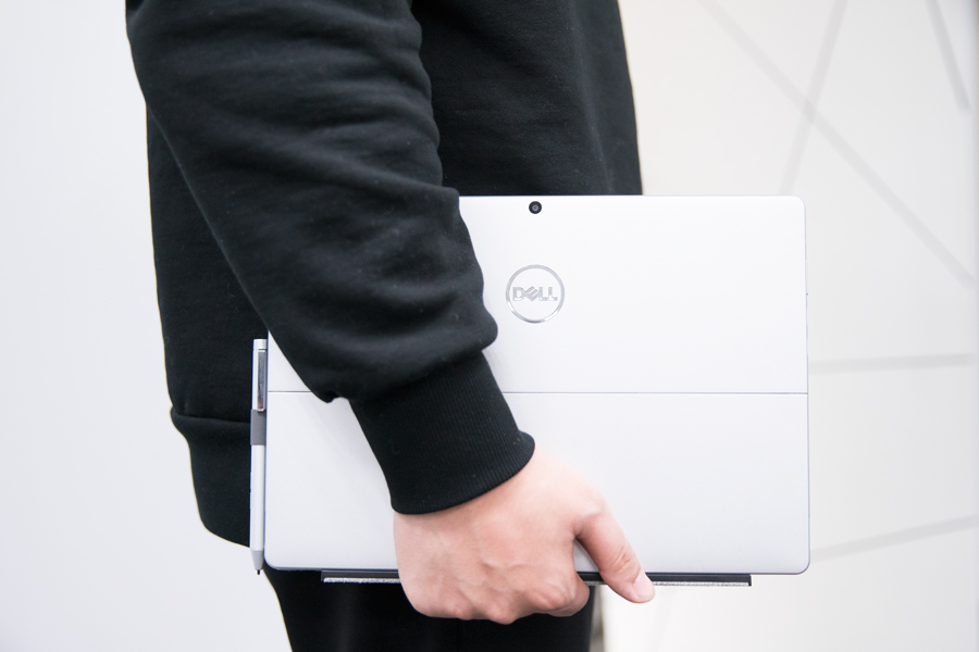 機身背部為金屬材料,后置攝像頭位于頂部正中間,擁有800萬像素、75°廣角,支持自動對焦。其下方是戴爾極具辨識度的Logo。