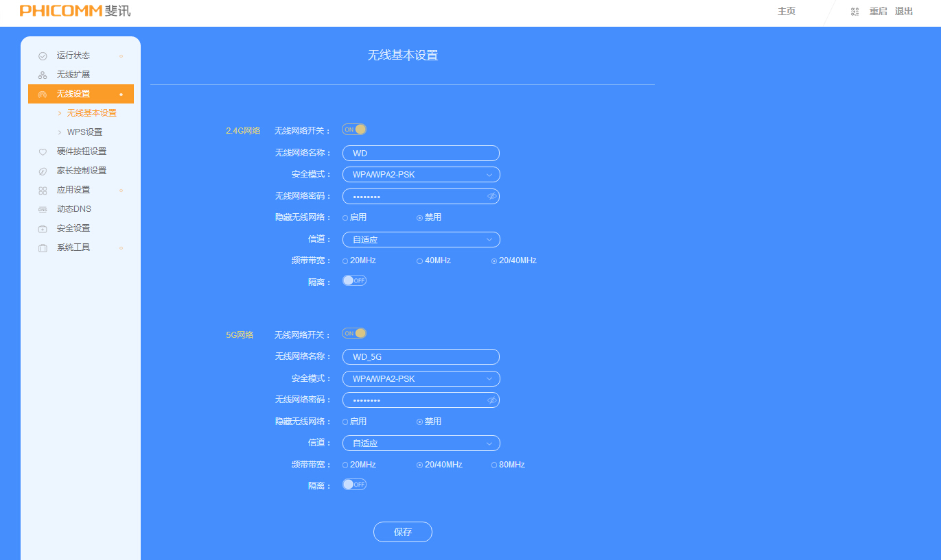 主頁面中的“上網向導”可對WiFi進行快捷設置,這里小編也為大家科普一下2.4GHz與5GHz的區別,一般情況下,使用2.4GHz頻段的設備較多,雖然穿透能力不錯,但是容易受到干擾,網絡因此變得不那么穩定,而5GHz頻段也因此而生,在穿透力上雖然不強,但是不易受干擾,能夠提供更大的帶寬,可以給用戶提供一個更高速的上網環境。K2的常規設置就包含了2.4GHz和5GHz來進行設置。而右下角的“路由設置”也可對路由器的網絡進行快捷設置