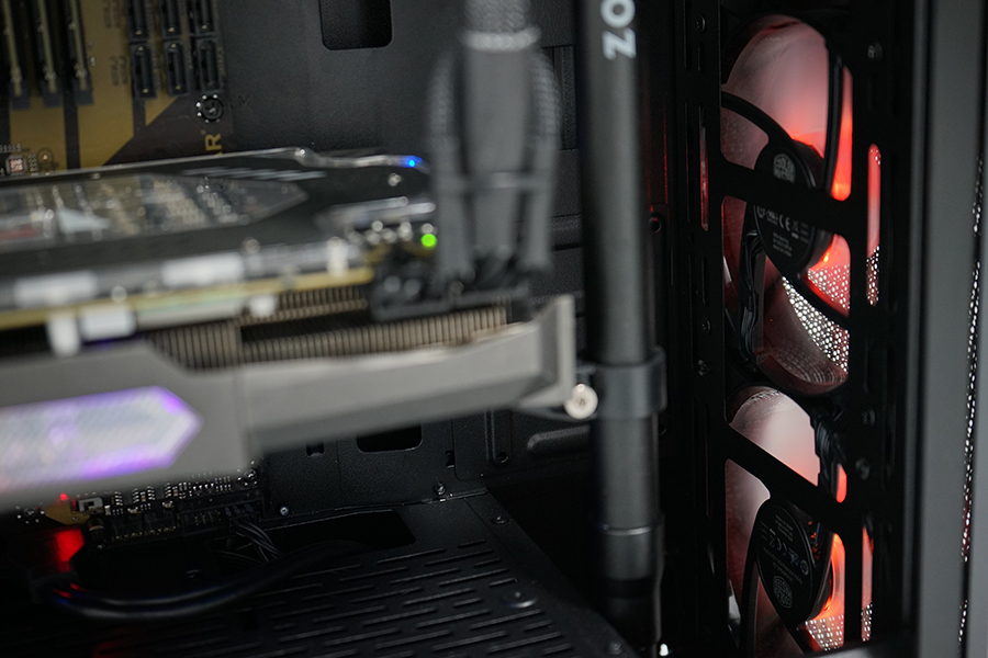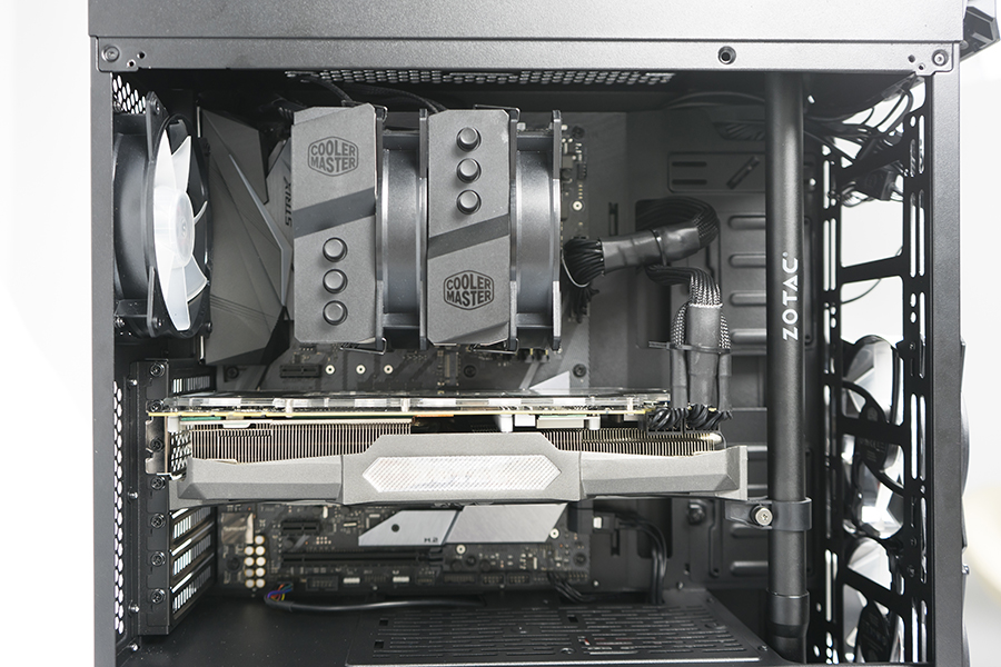 實裝效果非常完美。不但放下310mm長度的1080ti綽綽有余,2.5寸硬盤位前的空間還可以放下顯卡支撐架。在安裝前我們即使知道其散熱器限高為166mm,面對T620P的165mm大塊頭依然捏了一把汗。不過MB500的確毫無虛標,完美地塞進了這個大家伙,看來對于自家產品的兼容的確到位,對于其他品牌更是不在話下。