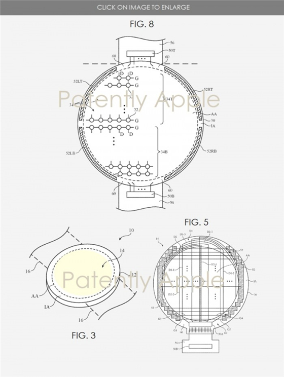 在蘋果最新的“具有彎曲邊緣顯示器的電子設(shè)備”專利中,蘋果改進(jìn)了顯示驅(qū)動(dòng)電路,使驅(qū)動(dòng)屏幕的信號分布更加均勻,大大提升了圓形屏幕的邊緣利用率。